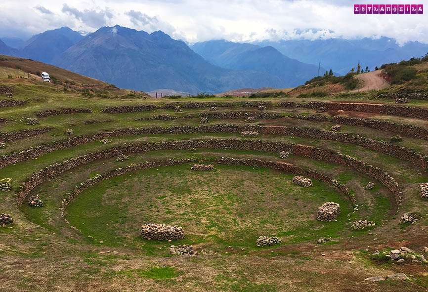 Nessa área montanhosa ficam umas construções redondas, uma original dos incas com mais de 500 anos e outra reconstruída na década de 70. Existem duas possíveis explicações para elas. Uma que poderia ter sido um templo e outra que era um experimento de agricultura, onde eles testavam o plantio em diferentes níveis, cada uma com seu microclima, para ver as diferenças dependendo da temperatura, umidade…